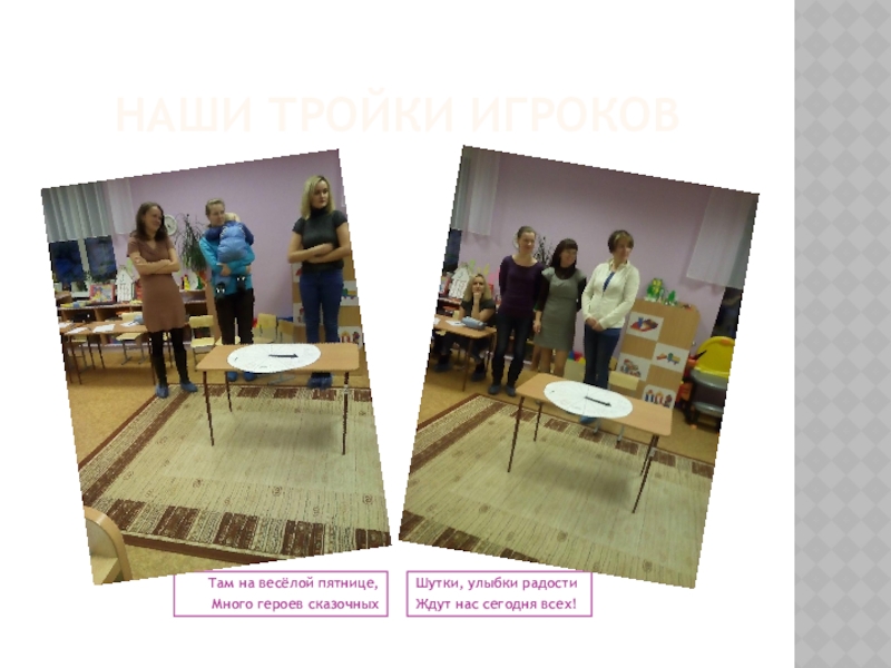 Наши тройки игроковТам на весёлой пятнице,Много героев сказочныхШутки, улыбки радостиЖдут нас сегодня всех!