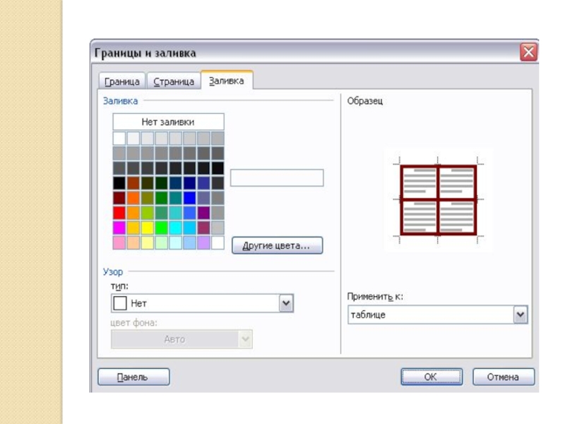 * Команда Таблица — Свойства таблицы — Таблица позволяет устанавливать границы и заливки в таблице.