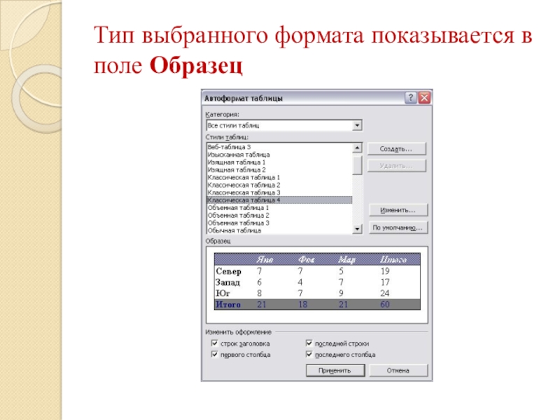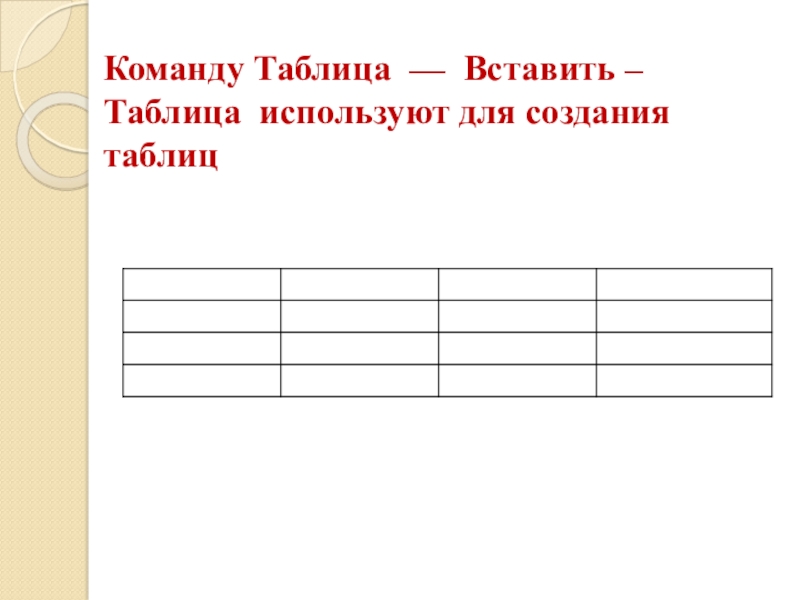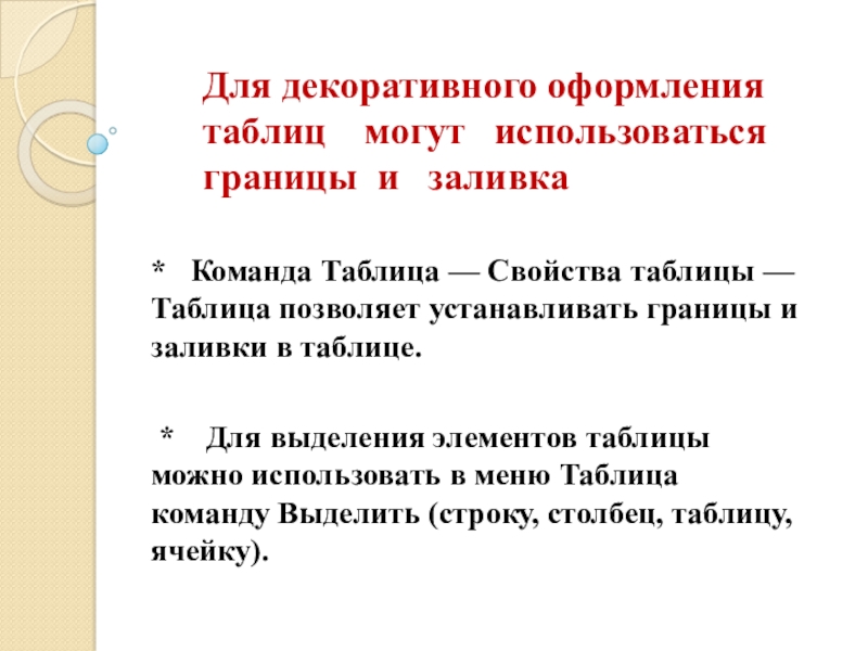 * Для выделения элементов таблицы можно использовать в меню Таблица команду Выделить (строку, столбец, таблицу, ячейку).