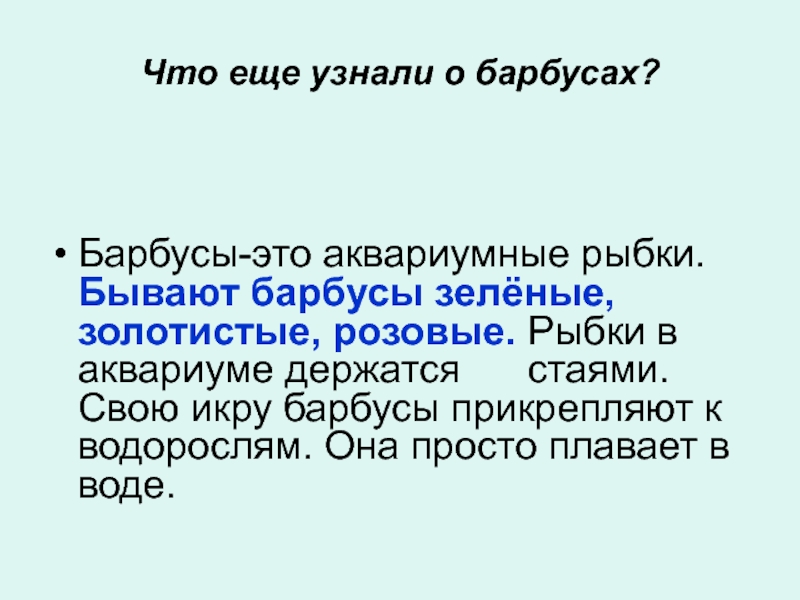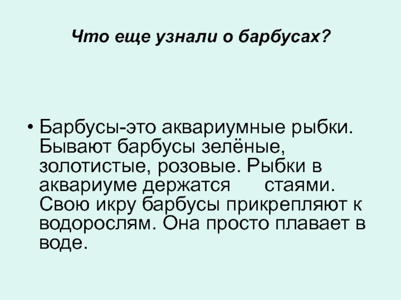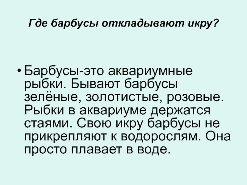 Бывают барбусы зелёные, золотистые, розовые. Рыбки в аквариуме держатся стаями. Свою икру барбусы прикрепляют к водорослям. Она просто плавает в воде.