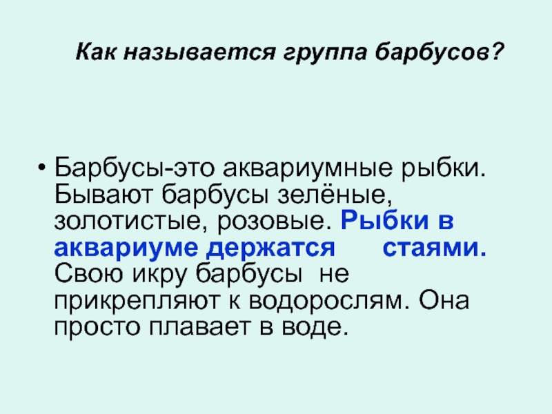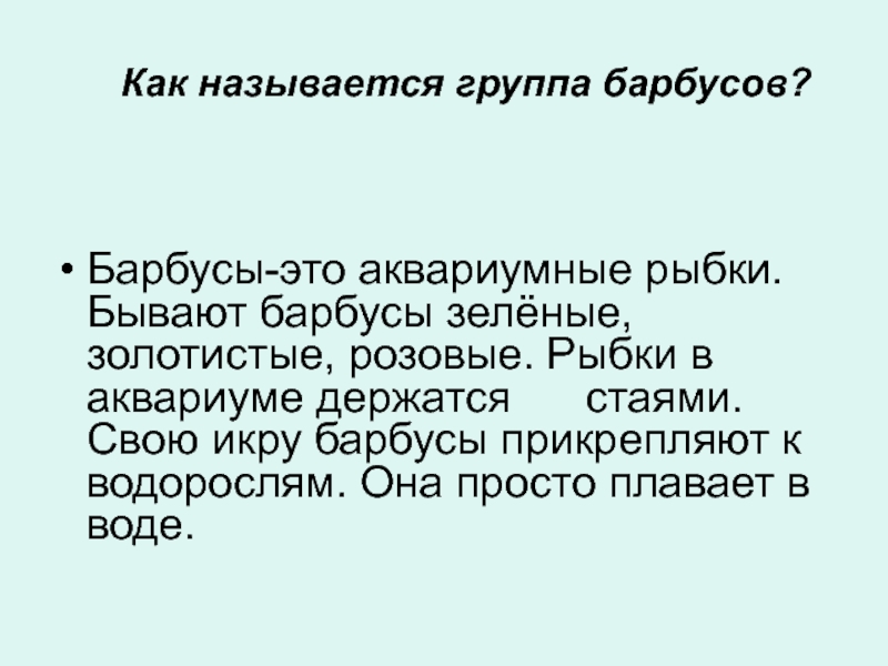Как называется группа барбусов?Барбусы-это аквариумные рыбки. Бывают барбусы зелёные, золотистые, розовые. Рыбки в аквариуме держатся