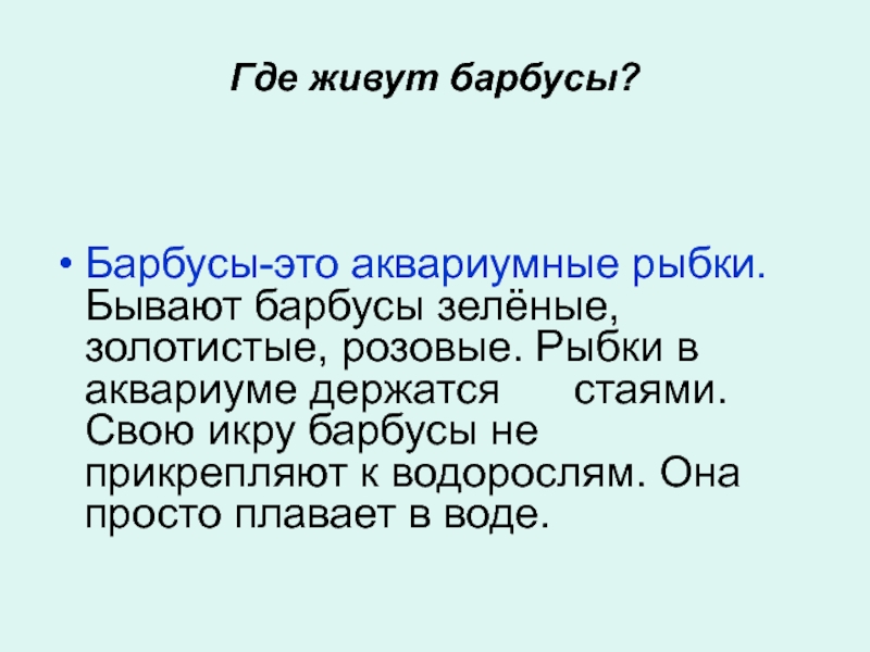 Найди ответ на вопрос предложением из текстаГде живут барбусы?Барбусы-это аквариумные рыбки. Бывают барбусы зелёные, золотистые, розовые. Рыбки