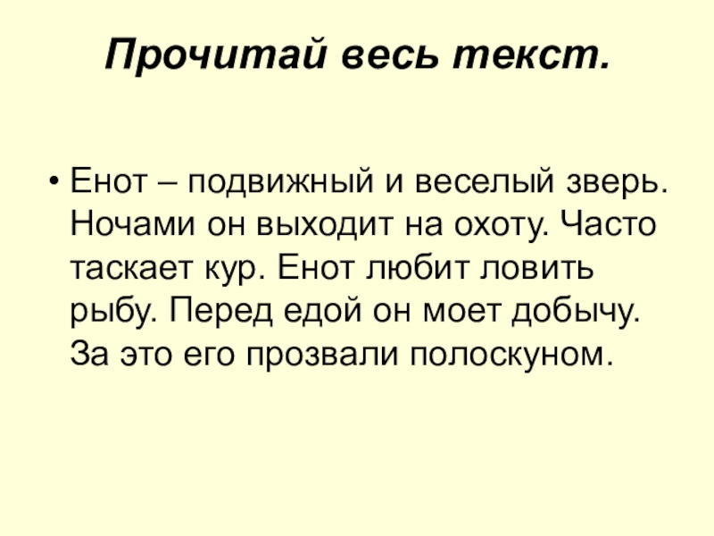 Прочитай весь текст.Енот – подвижный и веселый зверь. Ночами он выходит на охоту. Часто таскает кур. Енот
