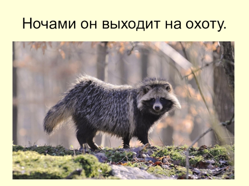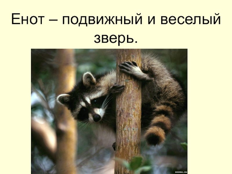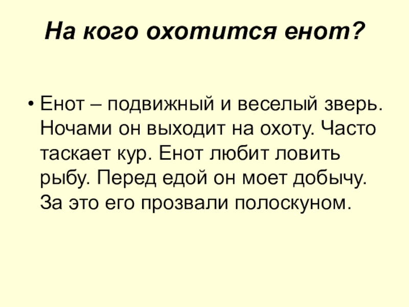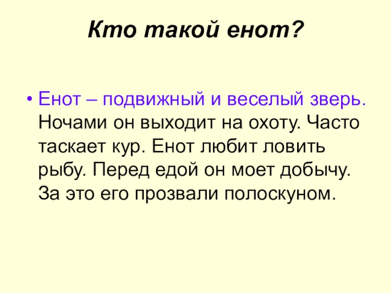 Кто такой енот?Енот – подвижный и веселый зверь. Ночами он выходит на охоту. Часто таскает кур. Енот