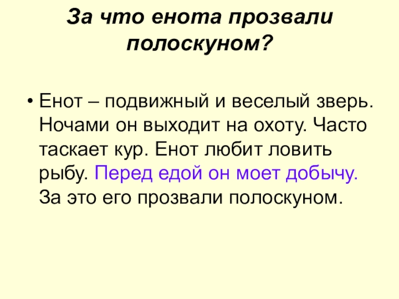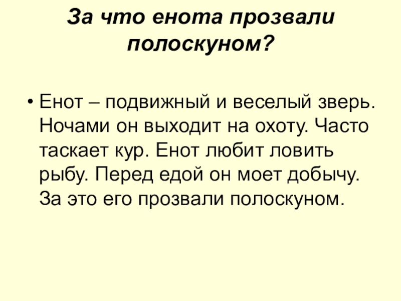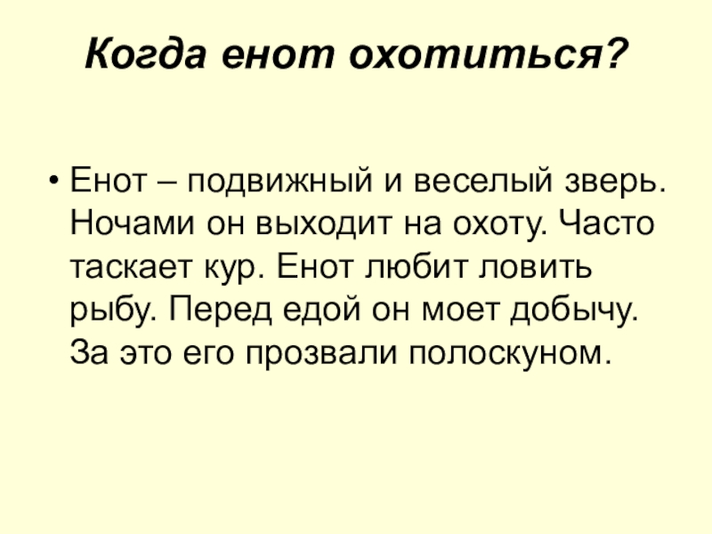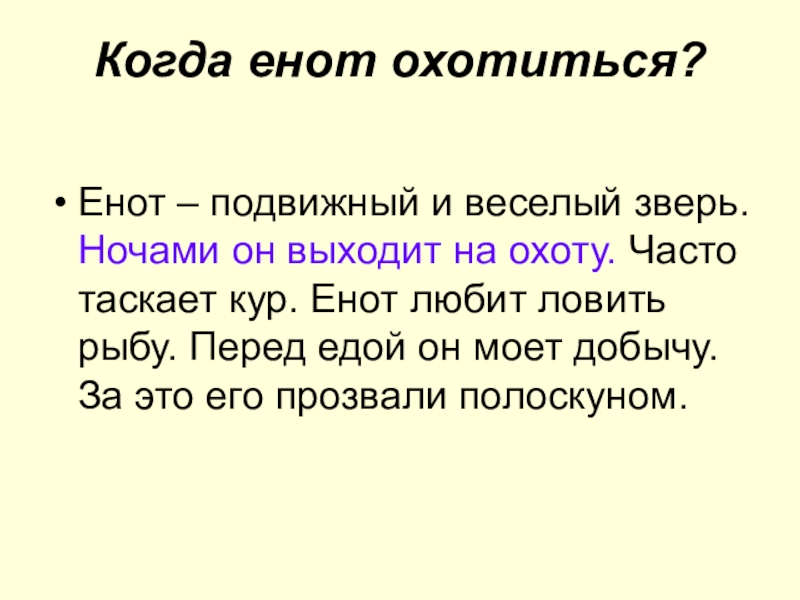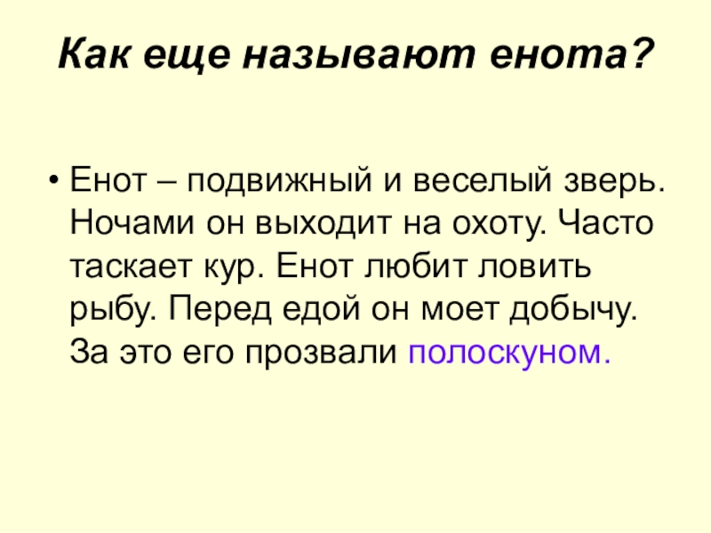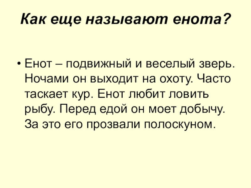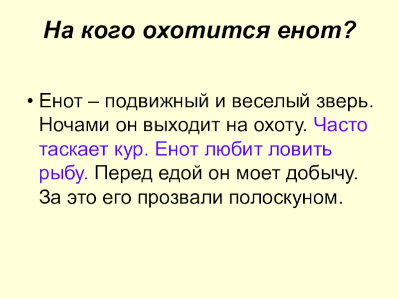 Как еще называют енота?Енот – подвижный и веселый зверь. Ночами он выходит на охоту. Часто таскает кур.
