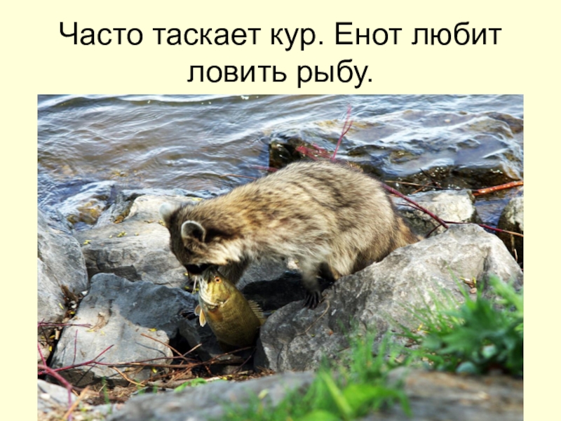 Слайд 4Часто таскает кур. Енот любит ловить рыбу.