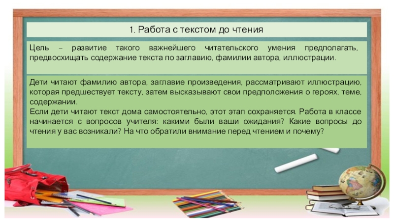 Если дети читают текст дома самостоятельно, этот этап сохраняется. Работа в классе начинается с вопросов учителя: какими были ваши ожидания? Какие вопросы до чтения у вас возникали? На что обратили внимание перед чтением и почему?