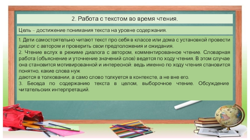 2. Чтение вслух в режиме диалога с автором, комментированное чтение. Словарная работа (объяснение и уточнение значений слов) ведется по ходу чтения. В этом случае она становится мотивированной и интересной: ведь именно по ходу чтения становится понятно, какие слова нуж