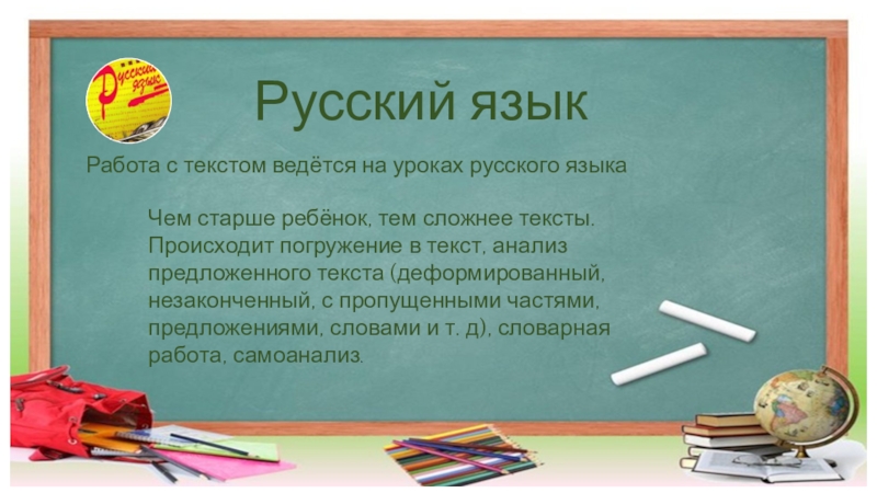 При работе с текстом прослеживается слияние обучения языку и речи: ученик учится видеть и понимать отдельные языковые явления и определять их место в системе языка в целом.