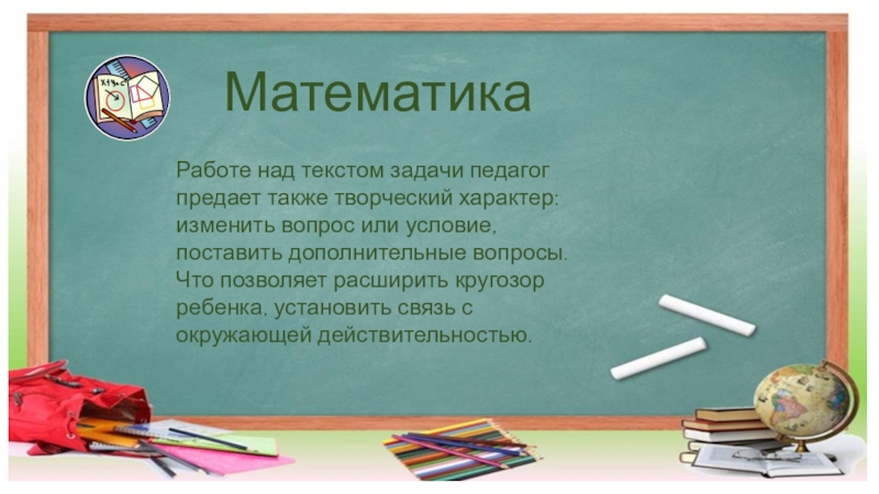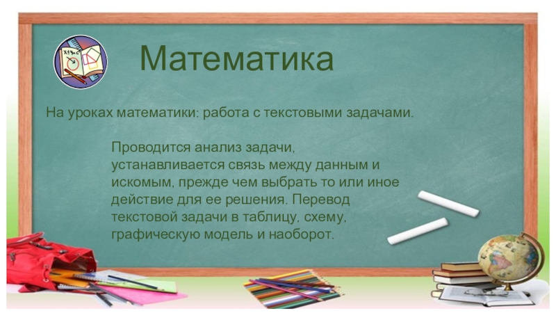 Слайд 22На уроках математики: работа с текстовыми задачами.