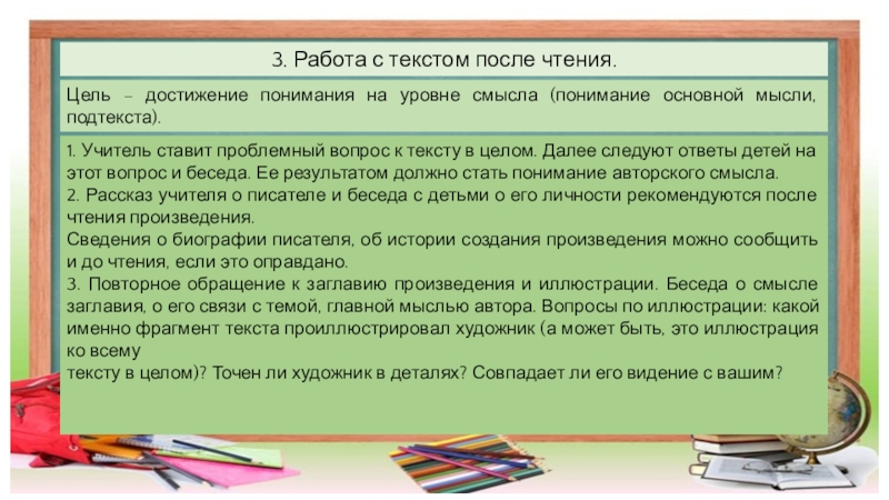 1. Учитель ставит проблемный вопрос к тексту в целом. Далее следуют ответы детей на этот вопрос и беседа. Ее результатом должно стать понимание авторского смысла.