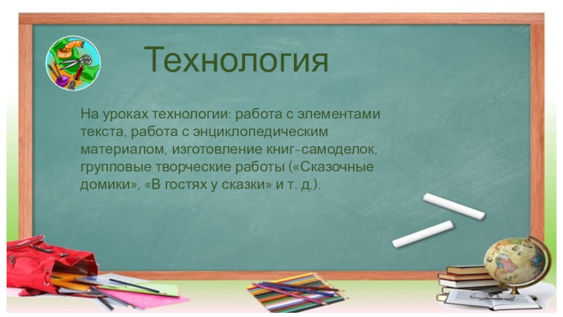 Слайд 26На уроках технологии: работа с элементами текста, работа с энциклопедическим материалом,