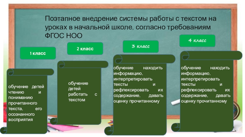 Слайд 13Поэтапное внедрение системы работы с текстом на уроках в начальной школе,