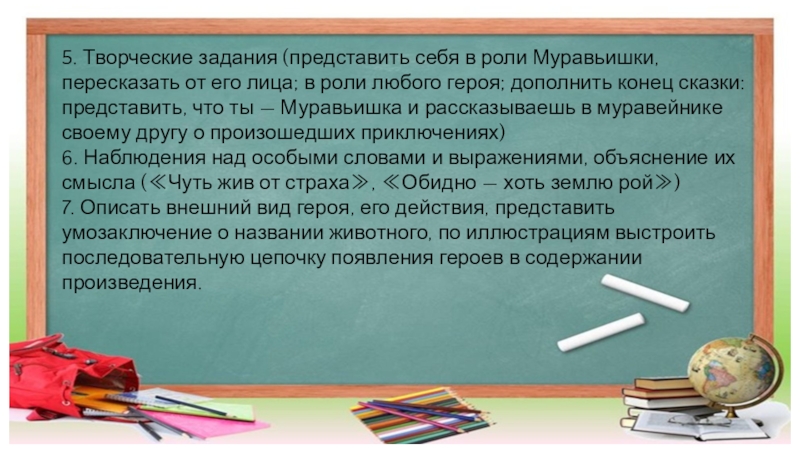 Слайд 355. Творческие задания (представить себя в роли Муравьишки, пересказать от его