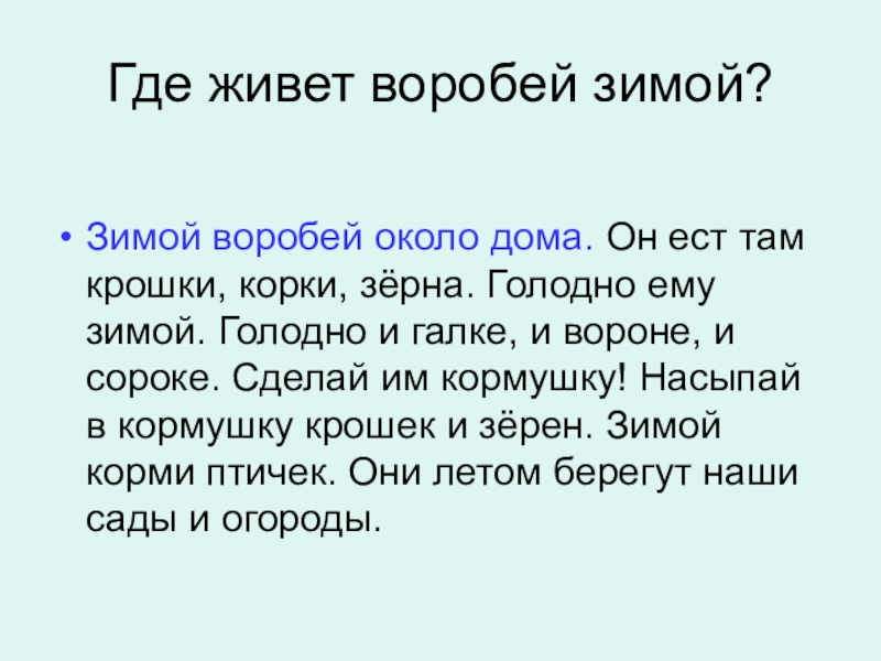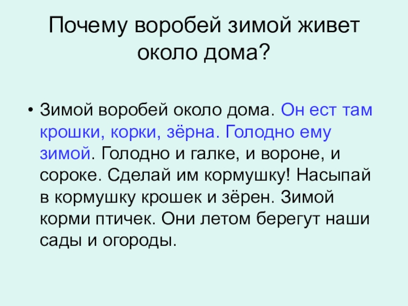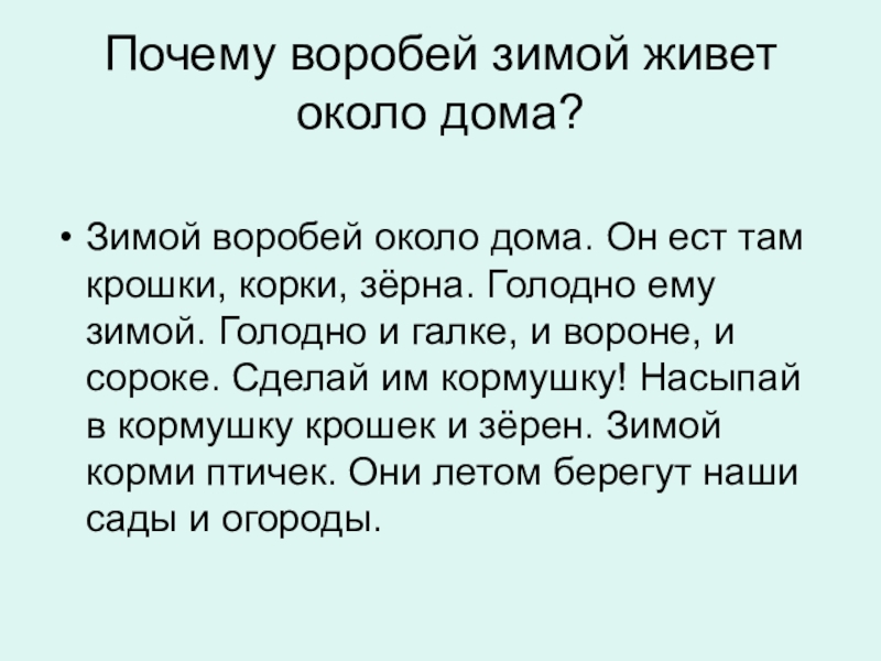 Слайд 13Почему воробей зимой живет около дома?