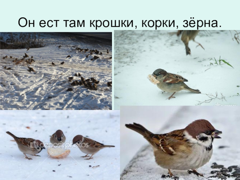Слайд 3Он ест там крошки, корки, зёрна.