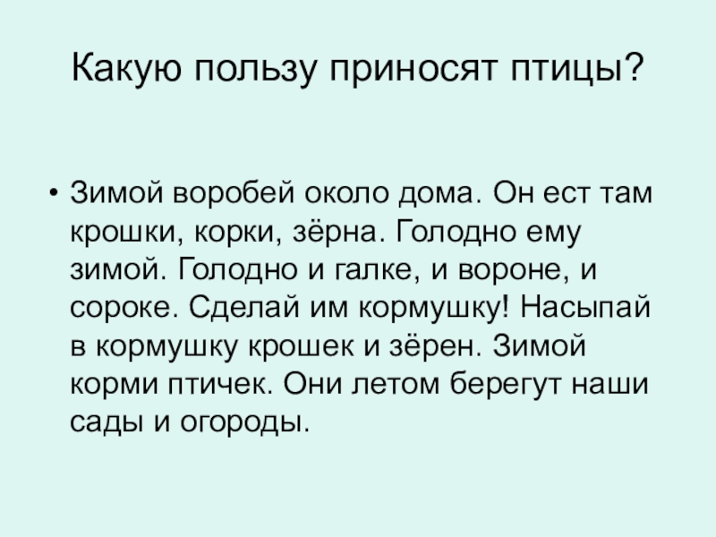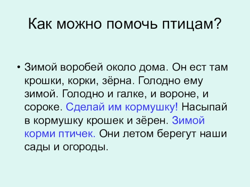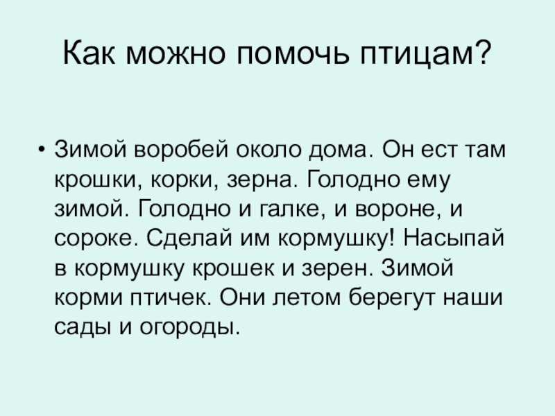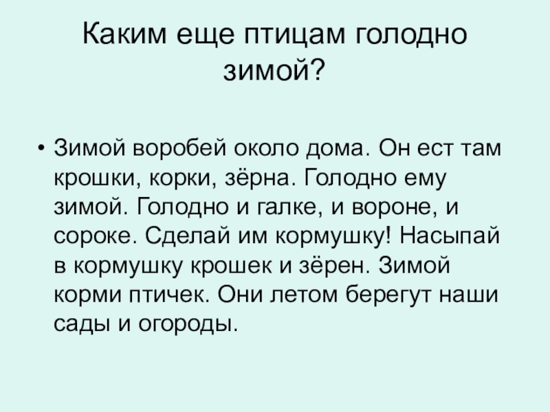 крошки, корки, зерна. Голодно ему зимой. Голодно и галке, и вороне, и сороке. Сделай им кормушку! Насыпай в кормушку крошек и зерен. Зимой корми птичек. Они летом берегут наши сады и огороды.