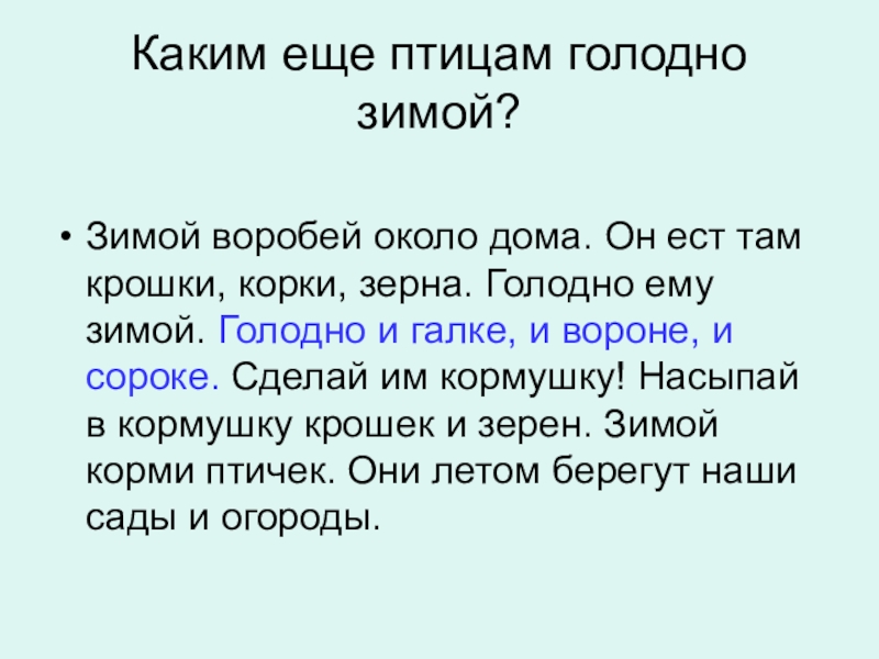 зёрна. Голодно ему зимой. Голодно и галке, и вороне, и сороке. Сделай им кормушку! Насыпай в кормушку крошек и зёрен. Зимой корми птичек. Они летом берегут наши сады и огороды.