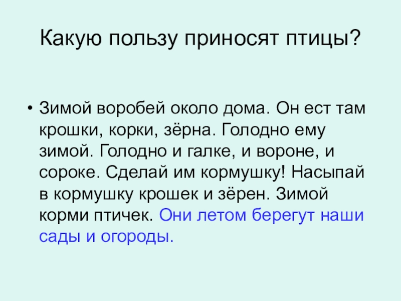 там крошки, корки, зёрна. Голодно ему зимой. Голодно и галке, и вороне, и сороке. Сделай им кормушку! Насыпай в кормушку крошек и зёрен. Зимой корми птичек. Они летом берегут наши сады и огороды.