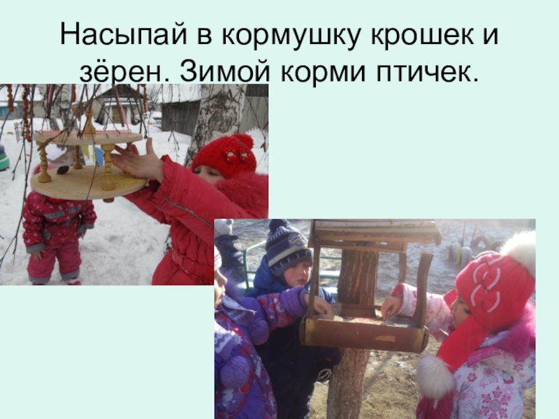 Слайд 7Насыпай в кормушку крошек и зёрен. Зимой корми птичек.