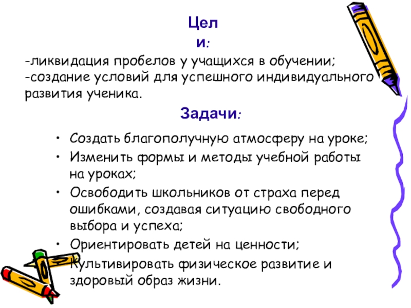 Освободить школьников от страха перед ошибками, создавая ситуацию свободного выбора и успеха;