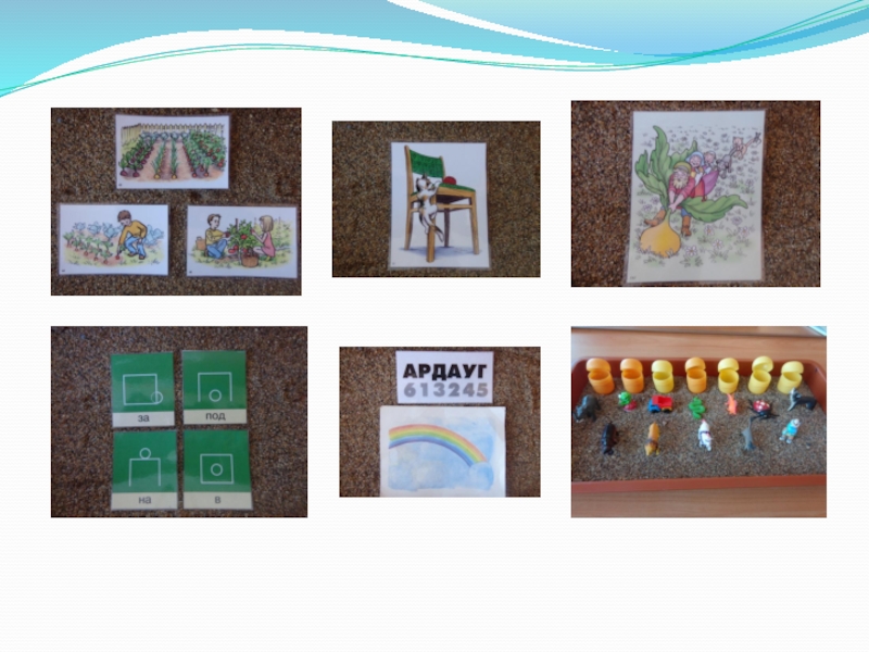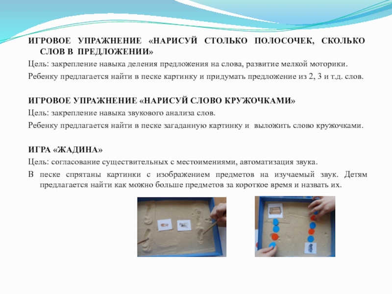 Ребенку предлагается найти в песке картинку и придумать предложение из 2, 3 и т.д. слов.