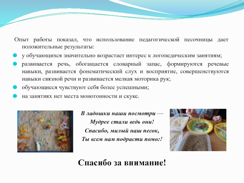 Слайд 29Опыт работы показал, что использование педагогической песочницы дает положительные результаты: