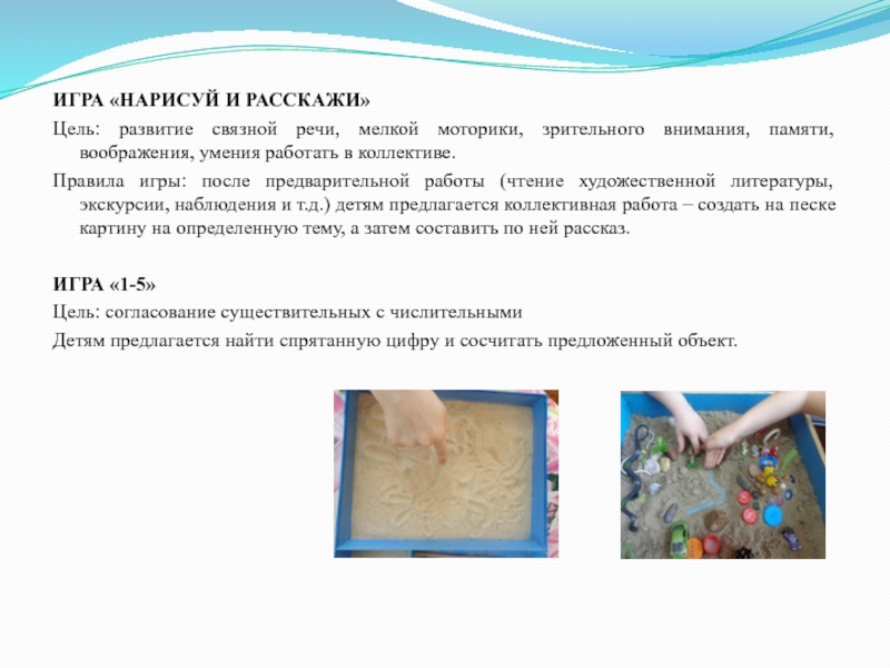 Правила игры: после предварительной работы (чтение художественной литературы, экскурсии, наблюдения и т.д.) детям предлагается коллективная работа – создать на песке картину на определенную тему, а затем составить по ней рассказ.