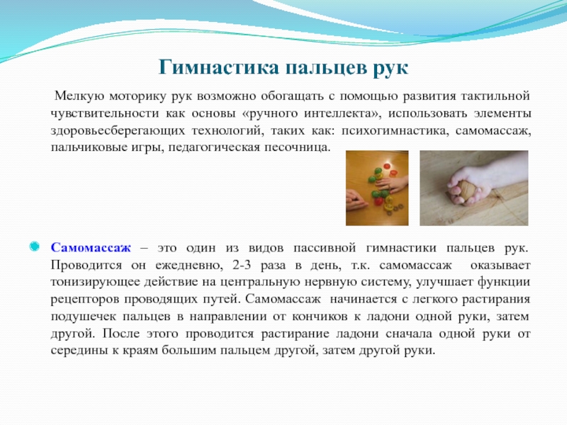 помощью развития тактильной чувствительности как основы «ручного интеллекта», использовать элементы здоровьесберегающих технологий, таких как: психогимнастика, самомассаж, пальчиковые игры, педагогическая песочница.