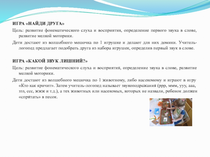 В песке спрятаны картинки с изображением предметов на изучаемый звук. Детям предлагается найти как можно больше предметов за короткое время и назвать их.
