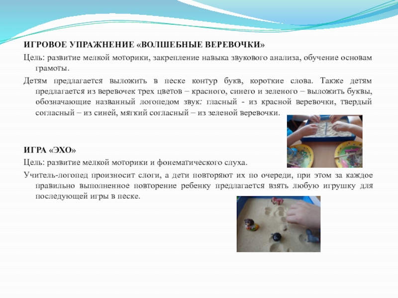 Детям предлагается выложить в песке контур букв, короткие слова. Также детям предлагается из веревочек трех цветов – красного, синего и зеленого – выложить буквы, обозначающие названный логопедом звук: гласный - из красной веревочки, твердый согласный – из синей, мягкий согласный – из зеленой веревочки.