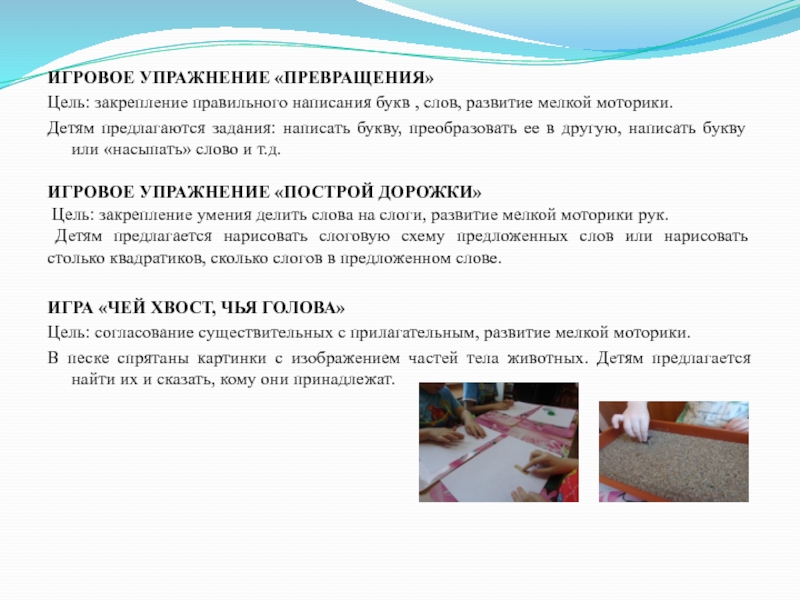 Детям предлагаются задания: написать букву, преобразовать ее в другую, написать букву или «насыпать» слово и т.д.