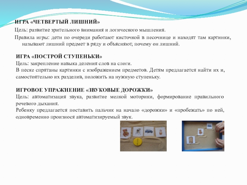 дети по очереди работают кисточкой в песочнице и находят там картинки, называют лишний предмет в ряду и объясняют, почему он лишний.