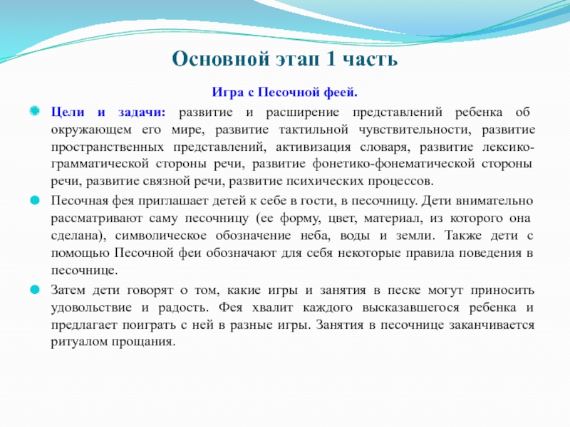 Затем дети говорят о том, какие игры и занятия в песке могут приносить удовольствие и радость. Фея хвалит каждого высказавшегося ребенка и предлагает поиграть с ней в разные игры. Занятия в песочнице заканчивается ритуалом прощания.