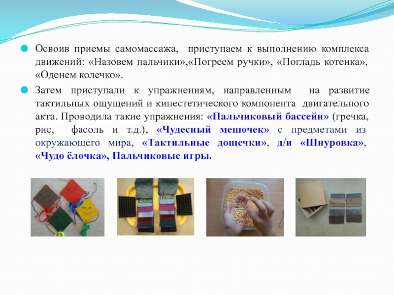 Затем приступали к упражнениям, направленным на развитие тактильных ощущений и кинестетического компонента двигательного акта. Проводила такие упражнения: «Пальчиковый бассейн» (гречка, рис, фасоль и т.д.), «Чудесный мешочек» с предметами из окружающего мира, «Тактильные дощечки», д/и «Шнуровка», «Чудо ёлочка», Пальчиковые игры.