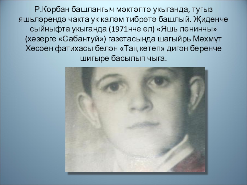 Слайд 11Р.Корбан башлангыч мәктәптә укыганда, тугыз яшьләрендә чакта ук каләм тибрәтә башлый.