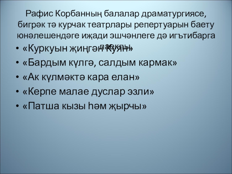 Слайд 21Рафис Корбанның балалар драматургиясе, бигрәк тә курчак театрлары репертуарын баету юнәлешендәге