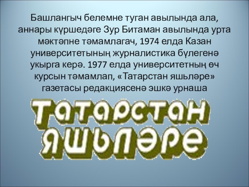 Слайд 7Башлангыч белемне туган авылында ала, аннары күршедәге Зур Битаман авылында урта
