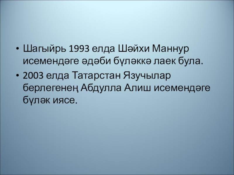 Шагыйрь 1993 елда Шәйхи Маннур исемендәге әдәби бүләккә лаек була.