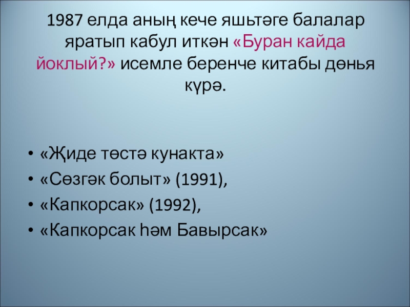 Слайд 131987 елда аның кече яшьтәге балалар яратып кабул иткән «Буран кайда