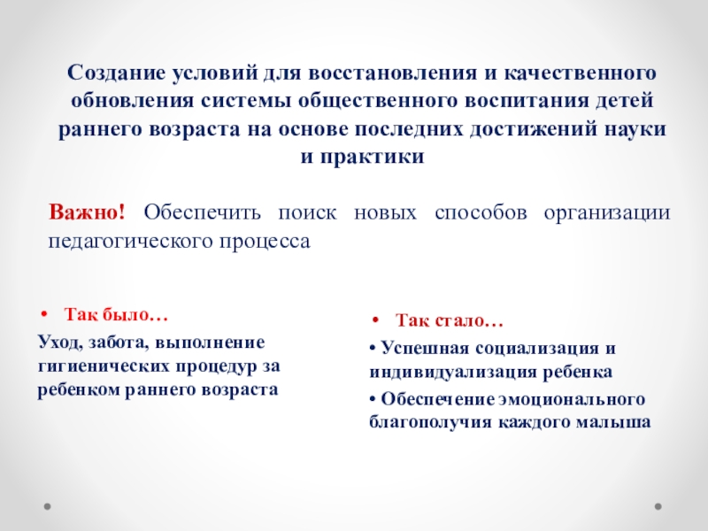 Создание условий для восстановления и качественного обновления системы общественного воспитания детей раннего возраста на основе последних достижений науки и практики