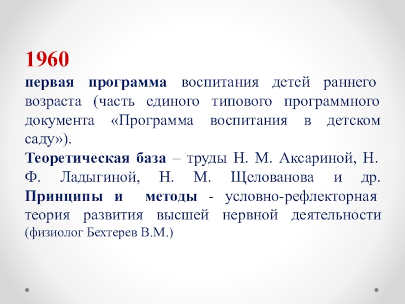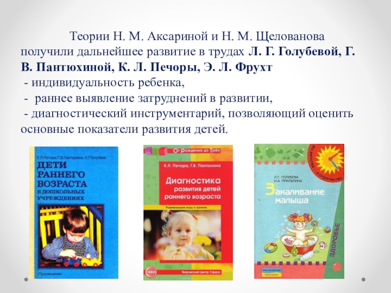 Аксариной и Н. М. Щелованова получили дальнейшее развитие в трудах Л. Г. Голубевой, Г. В. Пантюхиной, К. Л. Печоры, Э. Л. Фрухт