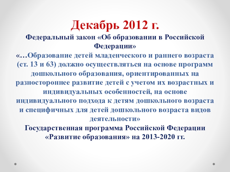 младенческого и раннего возраста (ст. 13 и 63) должно осуществляться на основе программ дошкольного образования, ориентированных на разностороннее развитие детей с учетом их возрастных и индивидуальных особенностей, на основе индивидуального подхода к детям дошкольного возраста и специфичных для детей дошкольного возраста видов деятельности»