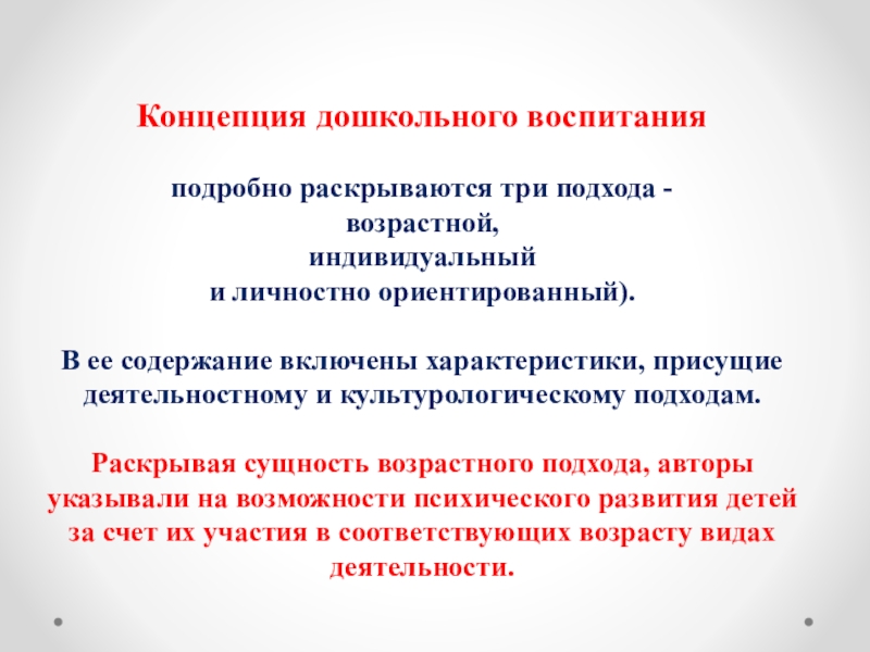 Раскрывая сущность возрастного подхода, авторы указывали на возможности психического развития детей за счет их участия в соответствующих возрасту видах деятельности.