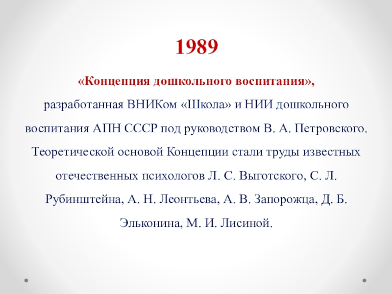 Теоретической основой Концепции стали труды известных отечественных психологов Л. С. Выготского, С. Л. Рубинштейна, А. Н. Леонтьева, А. В. Запорожца, Д. Б. Эльконина, М. И. Лисиной.