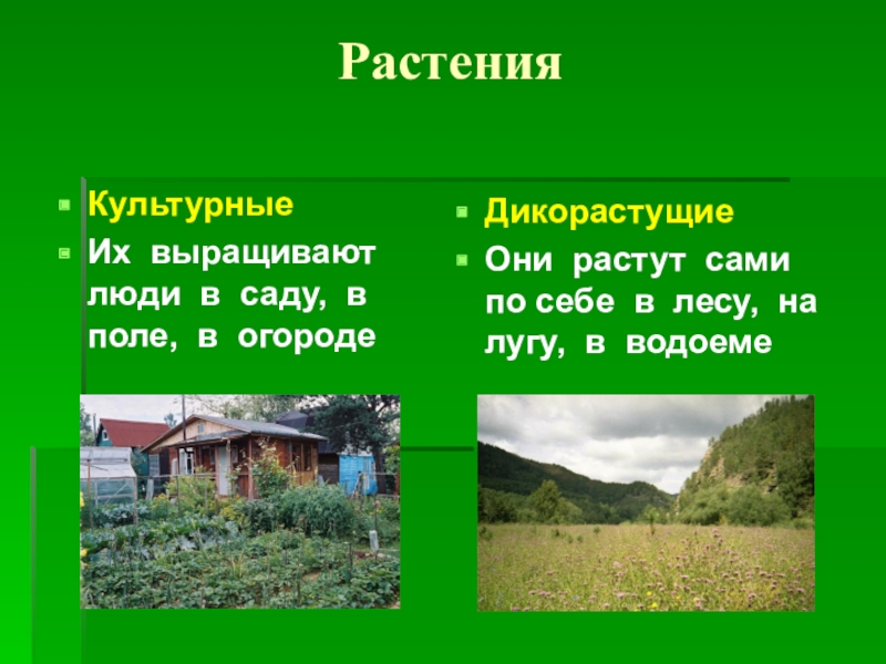 Растения КультурныеИх выращивают люди в саду, в поле, в огороде Дикорастущие Они растут сами по себе в