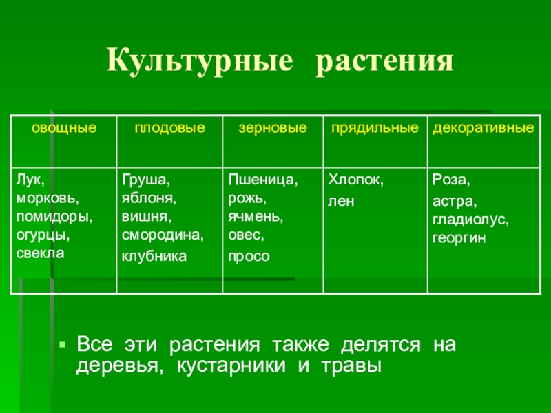 Культурные растенияВсе эти растения также делятся на деревья, кустарники и травы