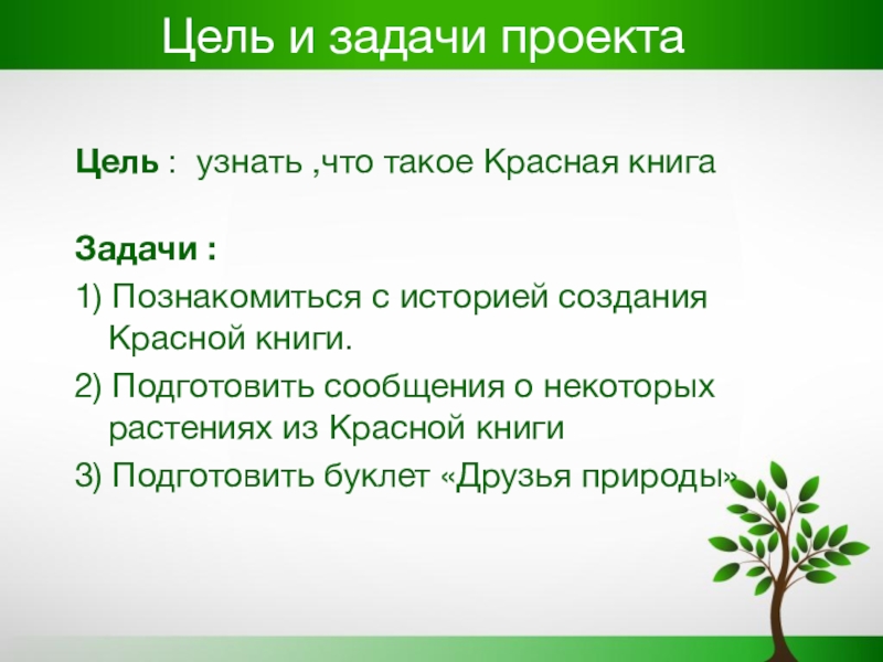 Цель и задачи проектаЦель : узнать ,что такое Красная книгаЗадачи :1) Познакомиться с историей создания Красной книги.