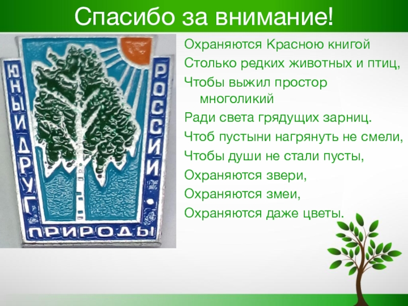 Спасибо за внимание!Охраняются Красною книгойСтолько редких животных и птиц, Чтобы выжил простор многоликийРади света грядущих зарниц.Чтоб пустыни
