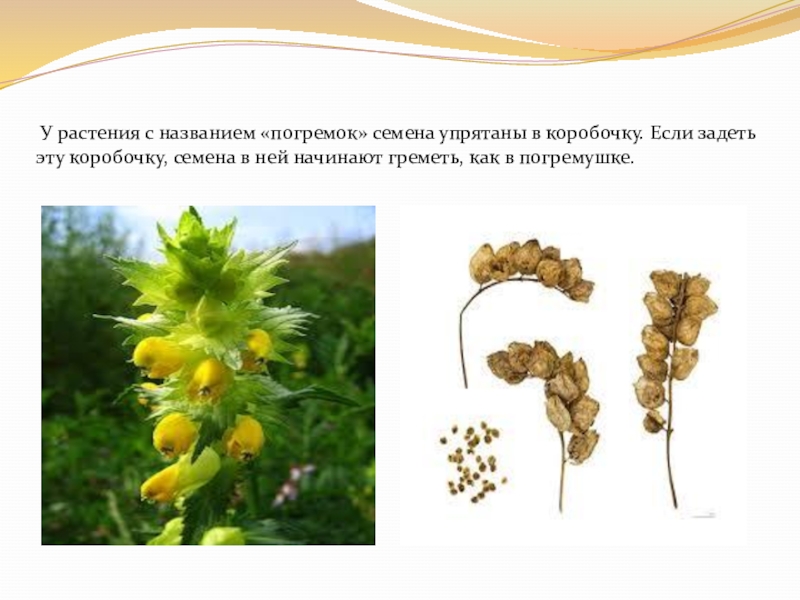 У растения с названием «погремок» семена упрятаны в коробочку. Если задеть эту коробочку, семена в ней